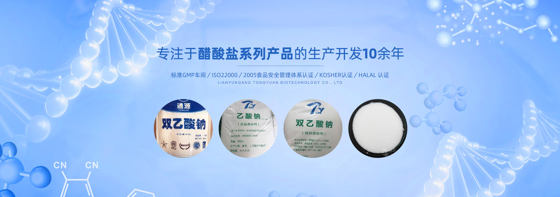 連云港市通源生物科技有限公司 是生產(chǎn)雙乙酸鈉、無水醋酸鈉、三水醋酸鈉、醋酸鉀、乙酸鈉、丙酸鈉、丙酸鈣和氯化鉀等系類醋酸鹽產(chǎn)品的專業(yè)制造商。公司專注于醋酸鹽系列產(chǎn)品的生產(chǎn)開發(fā)10余年,是國內(nèi)專業(yè)醋酸酸鹽產(chǎn)品生產(chǎn)基地。 目前,我們已和全球30多個國家和地區(qū)建立長期的業(yè)務合作關系,是中國較大的雙乙酸鈉生產(chǎn)商和出口商之一。作為中國食品添加劑和配料協(xié)會理事單位,通源公司已建成標準GMP車間5000余平方米,通過了ISO22000:2005食品安全管理體系認證、KOSHER認證、HALAL 認證等,這些都是我們提供高質量產(chǎn)品和優(yōu)良服務的前提和確保。 生產(chǎn)出色產(chǎn)品,提供優(yōu)良服務,滿足顧客需要,是我們努力的目標。愿和我們的朋友們攜手,共...